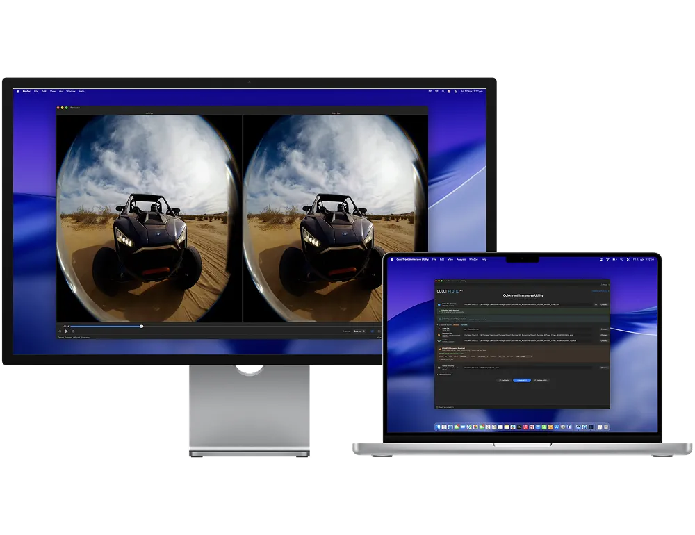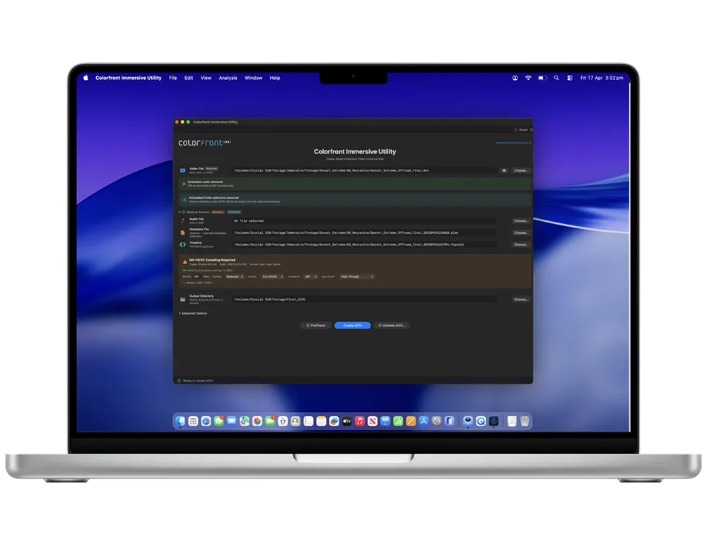Turn your footage into Apple Immersive Video — in a single Mac app. Colorfront Immersive Utility takes you from ProRes or MV-HEVC source to a finished .aivu file for Apple Vision Pro, with Spatial Audio, foveated encoding, and GPU-accelerated Metal performance built in.