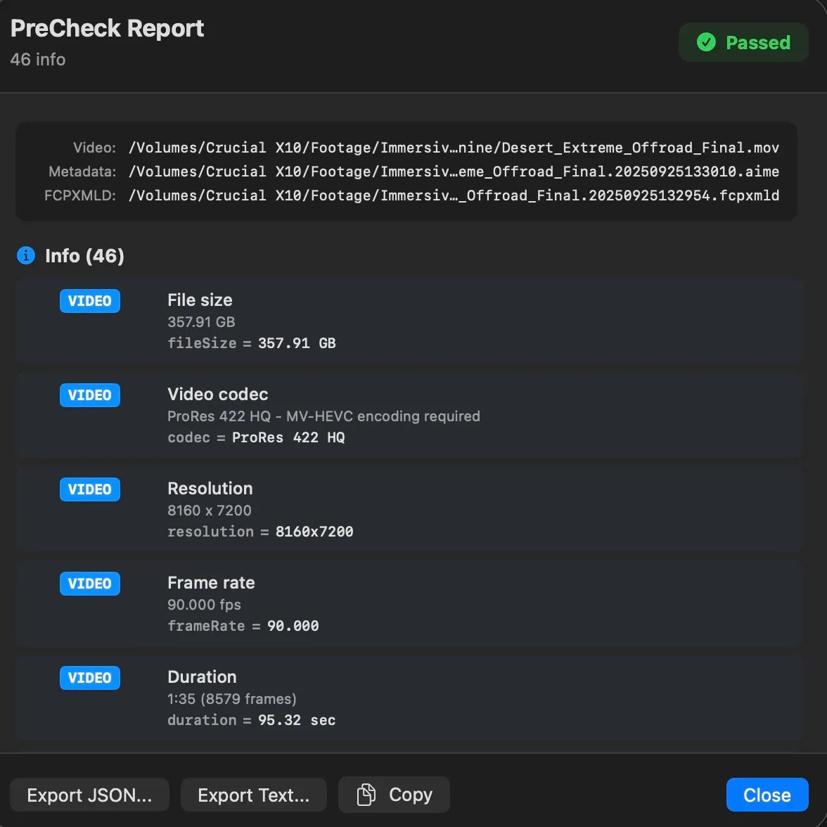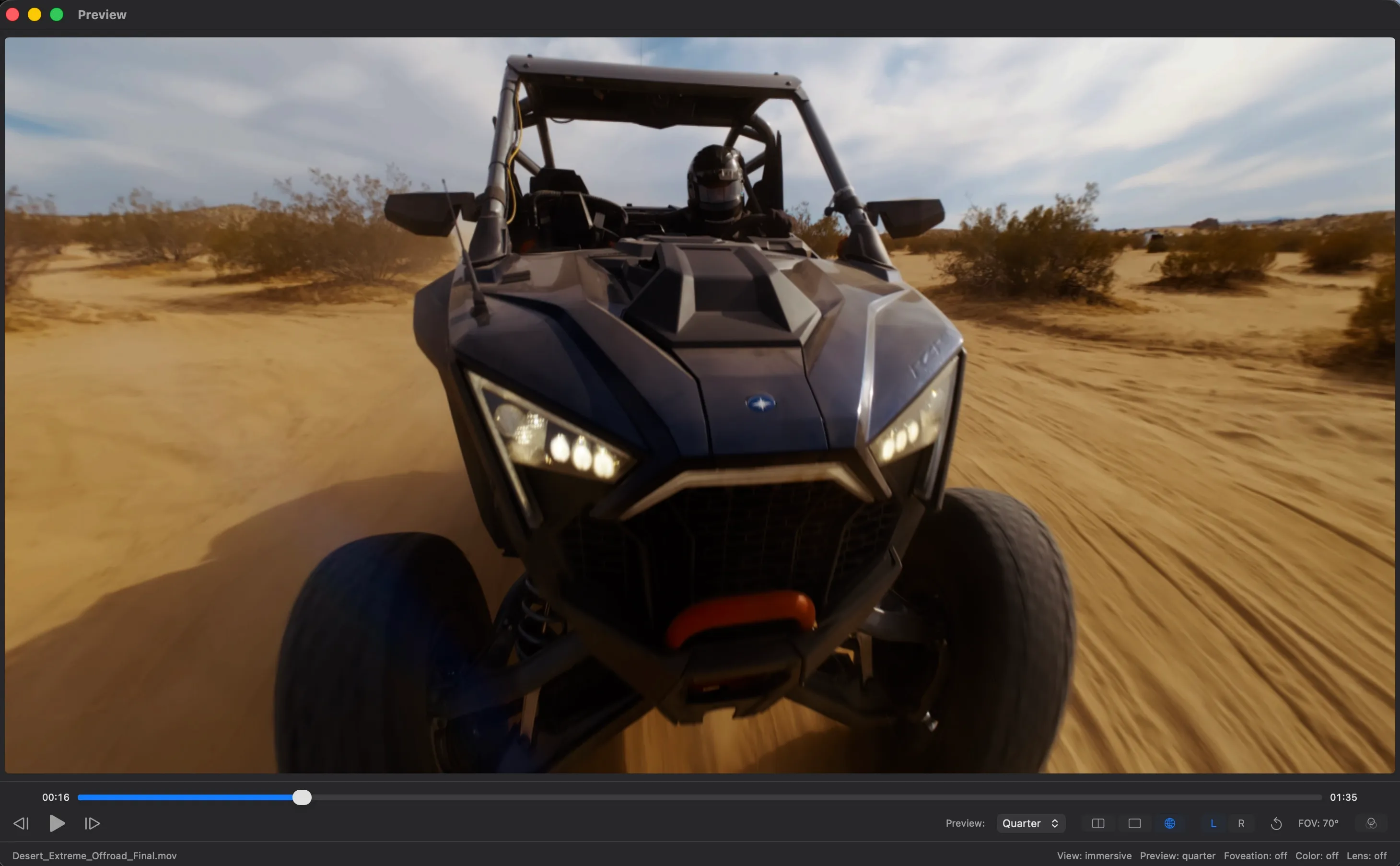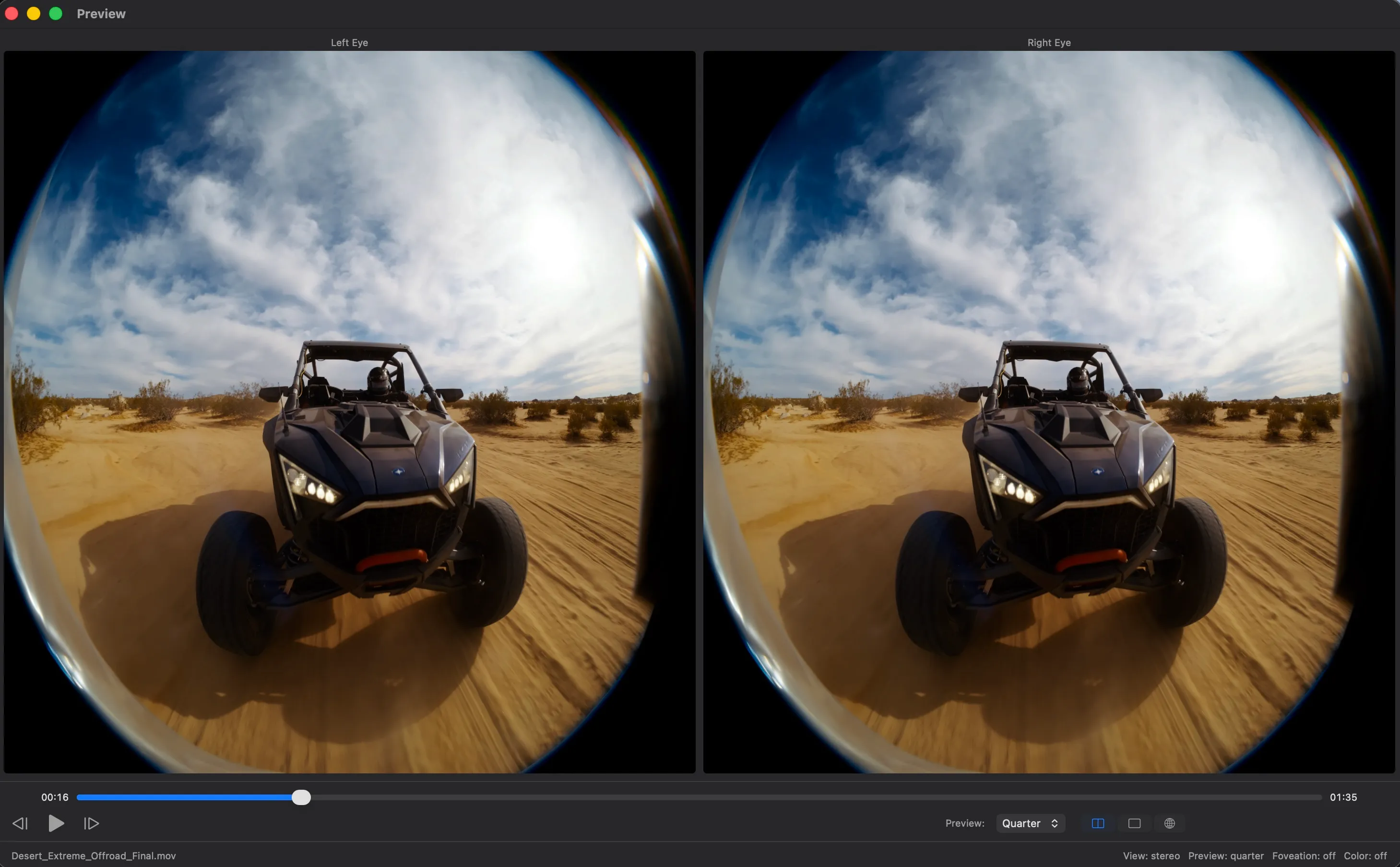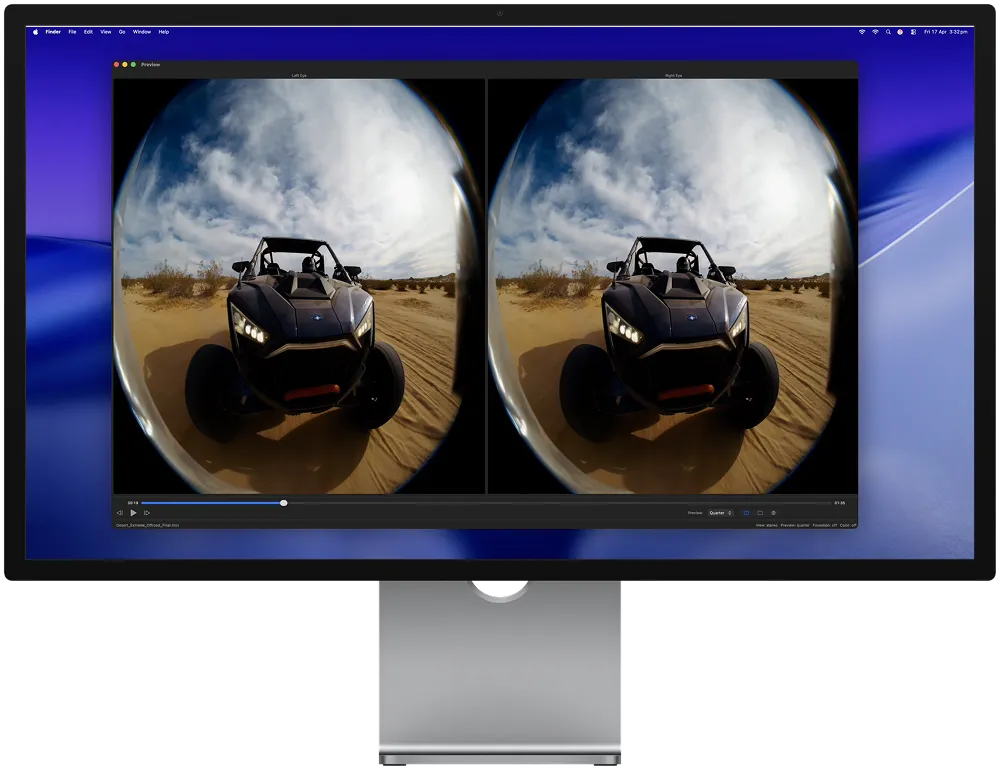 Behind the scenes, a GPU-accelerated Metal pipeline handles MV-HEVC encoding up to 4320p per eye, foveated resolution, P3 D65 PQ color conversion, and Spatial Audio via APAC — all on your Mac with Apple silicon.